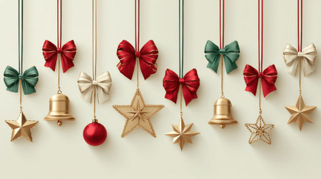 Bright and elegant Christmas decorations showcase vibrant bows, bells, and stars hanging gracefully, perfect for enhancing the festive holiday spirit and decorability.