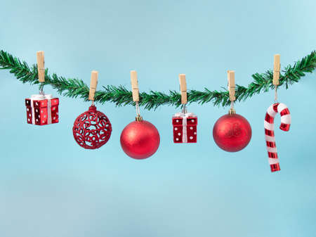 Winter Christmas creative concept of New Year decoration on drying clothes rope of evergreen tree with clothespin. Pastel blue background.