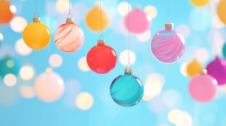 Colorful Glass Ornaments Hanging with Soft Bokeh Background for Festive Decor.
