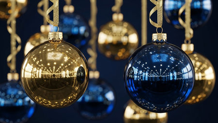 A stylish and minimalistic Christmas and New Year background showcasing golden and blue glass balls gracefully hanging on ribbons. This festive image blends elegance with simplicity, ideal for