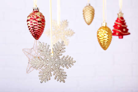 colored Christmas ball hanging on strings. festive background postcard for New Year,creative Christmas tree.Set Christmas baubles. Ideas for modern decoration, restaurant, hotel, winter wedding. Assortment of multicolor balls