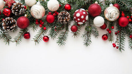 Christmas garland with red and white ornaments on a white background, a flat lay banner for a holiday greeting card or decoration template, with copy space - ai