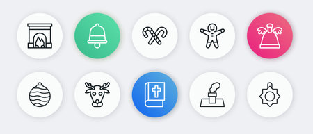 Set line Holy bible book Angel Christmas ball chimney Holiday gingerbread man cookie Candy cane with stripes toy and Reindeer icon. Vector.