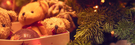 Close up branch of christmas tree with colorful balls and toys. New Year background. Winter backdrop