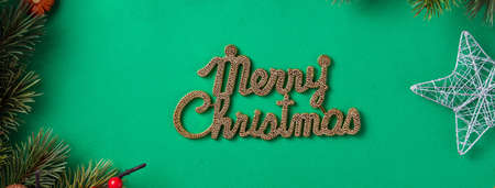 Top view of Christmas background design concept with fir tree branch and decorations on green table background.