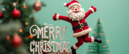 A cheerful Santa Claus figurine, dressed in his classic red suit, joyfully poses beside a whimsical MERRY CHRISTMAS sign, radiating festive spirit. The background features a beautifully decorated Christmas tree, adorned with shimmering ornaments, enhancing the warm and joyful atmosphere of the holiday season.