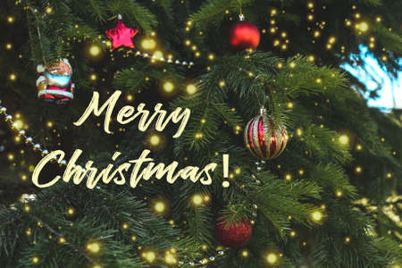 Red golden christmas baubles as decorations hang on christmas tree. Golden bokeh and Merry christmas lettering.