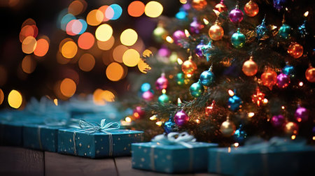 A close-up view of a Christmas tree adorned with wrapped gifts, ornaments, and festive decorations, creating a warm and inviting holiday atmosphere.