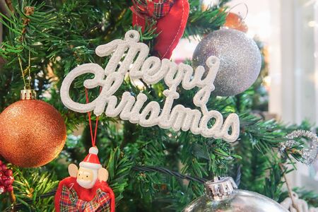 Merry Christmas holiday on the tree and copy space , toy socks, Merry Christmas on the bokeh background happy New Year and Family happiness festival background Beautiful decorations.White background