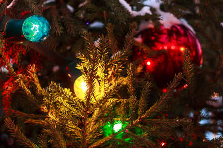 New Year's toys hang on an evergreen spruce, hung with sparkling garlands and covered with snow. Christmas decorations on the evening streets in the center of Moscow. Winter New Year holidays. Selective focus