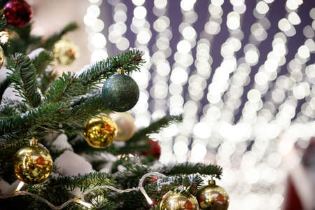 Seasonal background with Christmas toys on the tree. Celebration concept. Soft focus. Horizontal. Festive bold bokeh