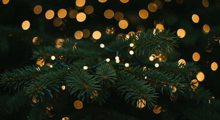 Soft glowing golden Christmas lights forming a bright festive bokeh on lush evergreen branches, creating a warm holiday atmosphere perfect for seasonal backgrounds