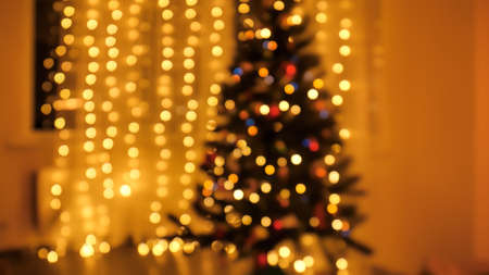 Bokeh of colorful Chsitmas tree lights at home. Wonter holiday decorations.