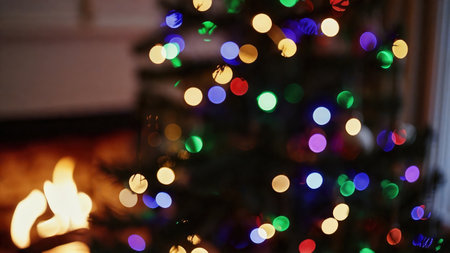 Vibrant christmas lights bokeh soft focus glowing multicolor circles blurred fireplace background festive party atmosphere abstract holiday pattern shimmer