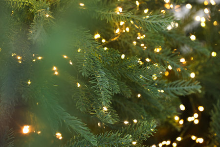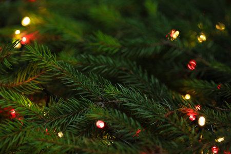 Branches with needles of pine tree with christmas lights on background. Close-up