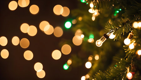 Close-up of Christmas lights on a tree, creating a warm and festive atmosphere.