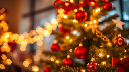 Christmas tree adorned with golden ornaments and sparkling lights, creating a warm and festive atmosphere for the holiday season. The image captures the magic and joy of christmas