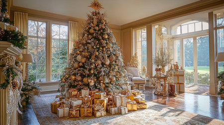 Glamorous holiday with a sparkling Christmas tree, elegant gift wrapping, and high-end ornaments