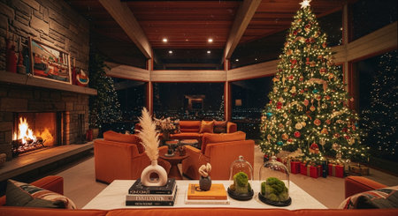 Luxurious living room with holiday decorations and a fireplace for the Christmas season. Concepts of festive home decor, holiday warmth, Christmas celebration.