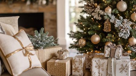 Tasteful holiday decor featuring a beautifully adorned Christmas tree, elegant wrapping paper, and coordinated gift boxes