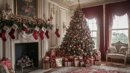 Christmas tree adorned with red and gold decorations and gifts beneath it, with a fireplace and hanging stockings, creating a classic holiday atmosphere.