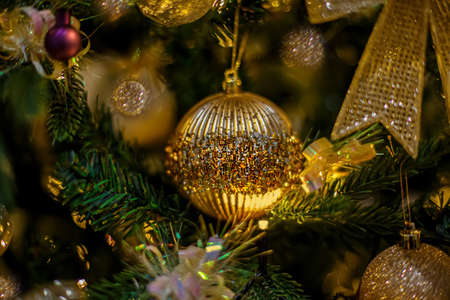 Christmas and New Year background. Festive decorations on the background of a Christmas tree.