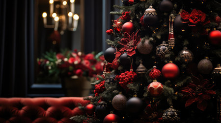 baubles black red christmas illustration lights festive, decorated sparkling, shiny holiday baubles black red christmas