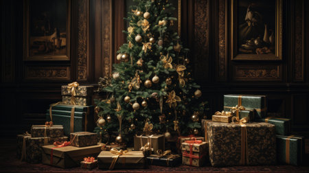 Glimmering ornaments hang from the lush tree while colorful presents await discovery during the joyous New Year celebration.
