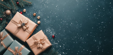 Christmas presents on dark blue background with festive decor.