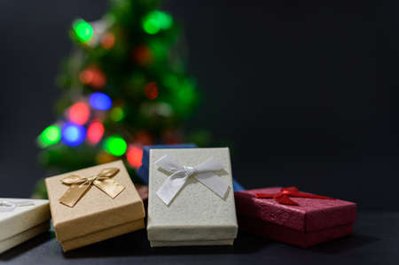 Christmas gifts surrounded by Christmas decorations. Snowflakes and leaves on a Christmas tree
