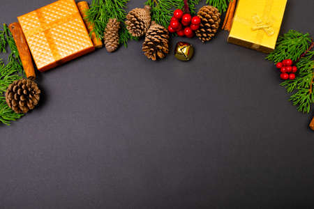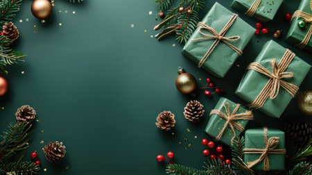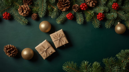 Christmas flat lay composition on dark green background with fir branches, pine cones, gift boxes, and Christmas ornaments. Space for text.