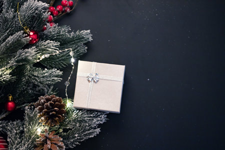 Black Christmas flat lay background. Holiday decorations with present box on black with copy space.