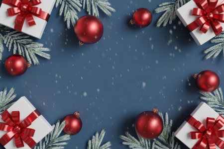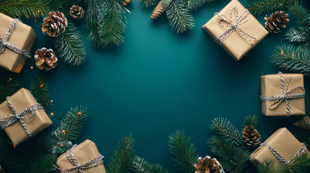 A top-down view of a beautiful Christmas flat lay with presents, fir branches, and shiny balls, providing ample space for a festive message or creative design.