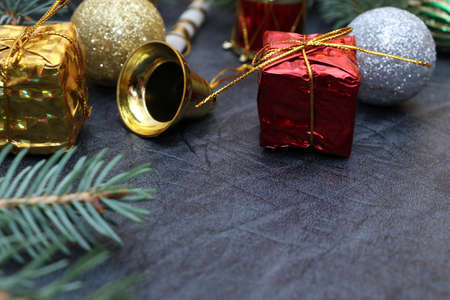 Merry christmas and a happy new year! A sprig of the green symbol of the winter holidays - spruce with decorations on a background of gray artificial leather backing.