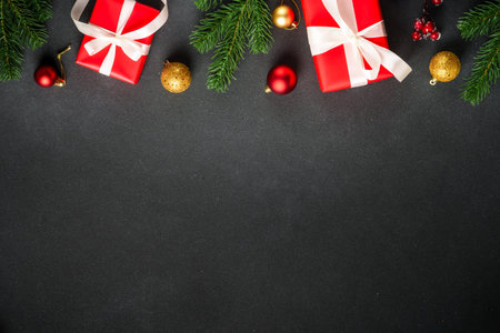 Christmas background with gift boxes, fir branches and decorations on black background