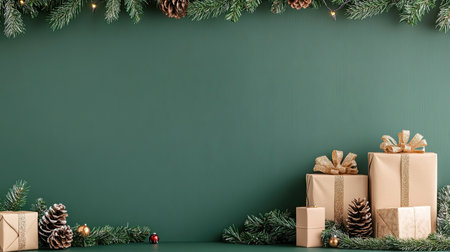 A charming festive arrangement featuring beautifully wrapped presents and pinecones on a deep green background, perfect for holiday themes.