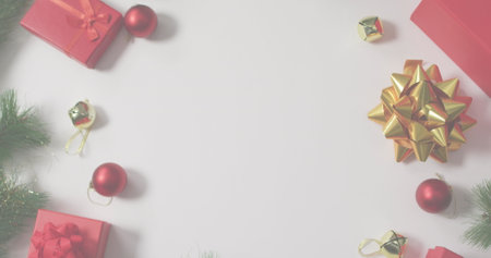 Top view of a Christmas flat lay with decorated presents, fir branches, and shiny ornaments, ideal for creating a holiday greeting card or promotional image