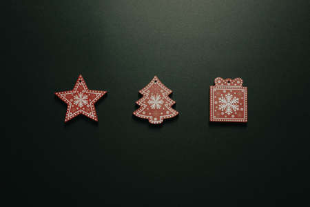 Christmas background concept. red stars on black background, christmas decor, flatlay.