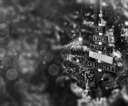 beautiful colorful Christmas greetings on a Christmas tree close-up on a background