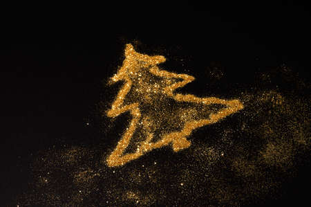Christmas tree made of golden glitter. Christmas, winter, new year concept. Flat lay, top view, copy space