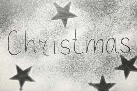 Christmas composition. Christmas text made with flour on black background. Top view, flat lay