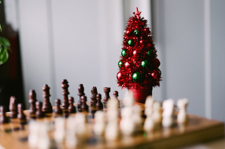 A wooden chess board with pieces on it. The board is on a table and there is a Christmas tree in the background