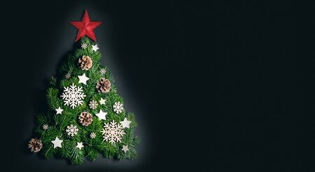 Christmas tree made of natural spruce branches deecor with red star on black background, flat lay card with copy space
