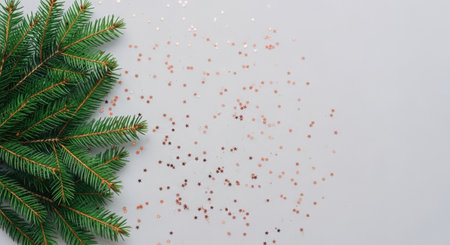 Christmas fir tree branches with shiny star glitter scattered on a clean light gray surface, offering a festive and elegant background for holiday designs.