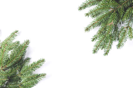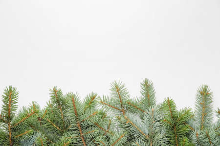 Christmas greeting card template. Fresh fir twig on white color background. Empty space for New Year wishes, winter holiday event invitation.