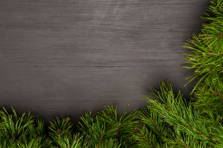 Christmas frame on black wooden background with natural pine fir-branches. Layout for Christmas design top view