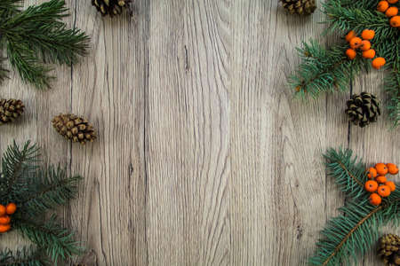 Christmas wooden background with natural decoration: fir tree, cones and rowanberries. Rustic wooden background, view from above. Flat lay, top view