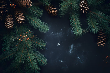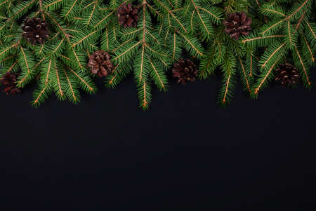 Fir branches with cones on dark background. Christmas border concept. Copy space.