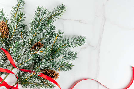 Christmas background for greeting card. Christmas tree branches with snow effect with festive red ribbon, on white marble background, top view copy space