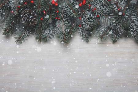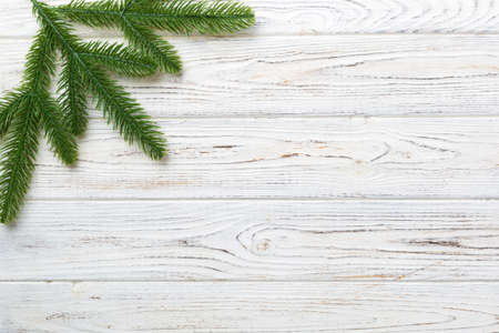 Christmas card. White wooden background with snow fir tree and decoration. Top view with copy space for your text